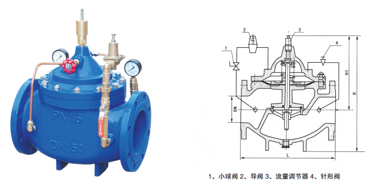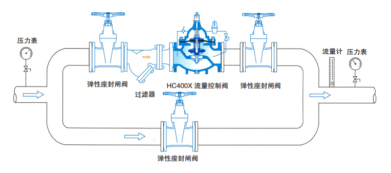 HC400X 流量控制閥,是一種采用高精度先導(dǎo)式方式控制流量的多功能閥門。適用于配水管需控制流量和壓力的管路中,保持預(yù)定流量不變,將過大流量限制在一個預(yù)定值,并將上游高壓適當(dāng)減低,即使主閥上游的壓力發(fā)生變化,也不會影響主閥下游的流量。該閥一改常規(guī)節(jié)流閥使用孔板或純機械地減小流域面積的原理,利用相關(guān)導(dǎo)閥,最大限度地減少能量在節(jié)流過程中的損失。如遇緊急情況 HC400X 流量控制閥可以完全截止流量,避免損失??刂旗`敏度高,安全可靠,調(diào)試簡便,使用壽命長。