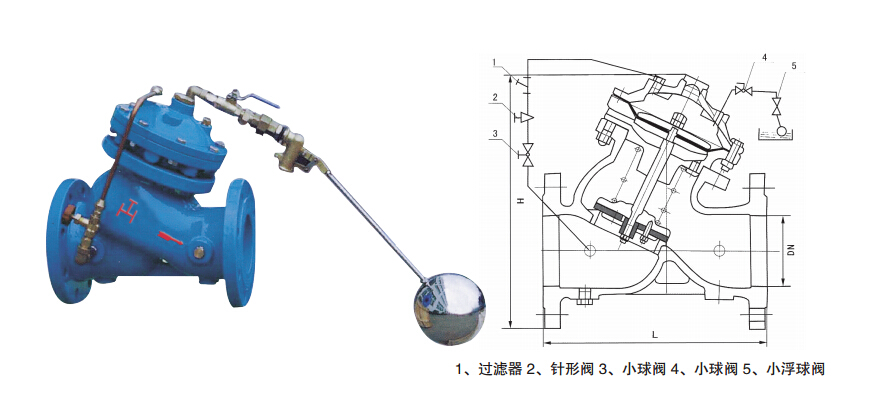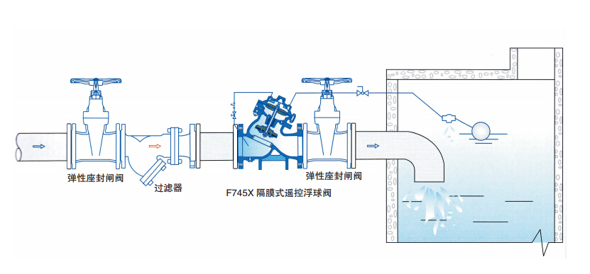 F745X 隔膜式遙控浮球閥是兼具多種功能的水力操作式閥門(mén)。主要安裝于水池或高架水塔的進(jìn)水口處,當(dāng)水位達(dá)到設(shè)定的高度時(shí),主閥由浮球?qū)чy控制關(guān)閉進(jìn)水口停止供水;當(dāng)水位下降后,主閥由浮球?qū)чy控制打開(kāi)進(jìn)水口向水池注水,實(shí)現(xiàn)自動(dòng)補(bǔ)水。液位控制精確,不受干擾;隔膜式遙控浮球閥可隨水池的高度及使用空間任意位置安裝,維護(hù)、調(diào)試、檢查方便、密封可靠,使用壽命長(zhǎng)。隔膜式閥門(mén)性能可靠、強(qiáng)度高、動(dòng)作平衡適用于 450 口徑以下的管道。